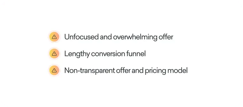 Lengthy Conversion Funnel: The user journey from initial engagement to conversion proved excessively long, with too many options in each step of the funnel and a lack of clear and engaging information that would take the user to the final destination - conversion.