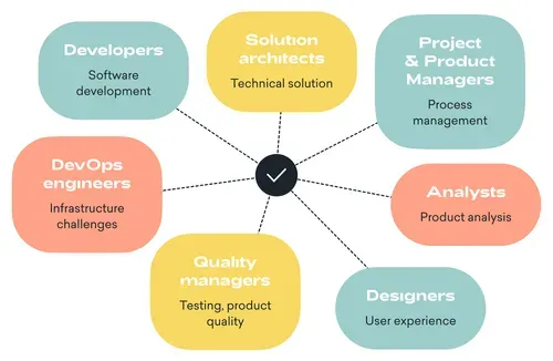 - DevOps engineers - if the solution is complex, infrastructure experts need to be involved to take care of the infrastructure, set up proper monitoring, prepare the system for a heavy load, etc.