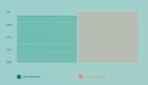 In general, we can expect dynamic dispatch to be slower than the same functions that use static dispatch. Those are indeed the results. The question here would be – at what cost? And the answer differs based on whether we are talking about generics or final classes.