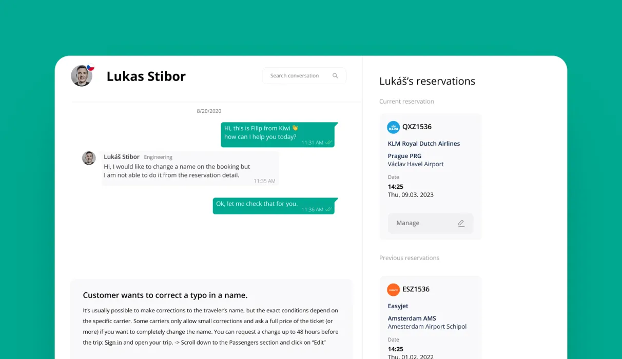 Kiwi.com je online cestovní kancelář s průkopnickou technologií Virtual Interlining a výjimečným zákaznickým servisem 24/7. Bezproblémově jsme začlenili ChatGPT do sekce FAQ jejich nativní aplikace.