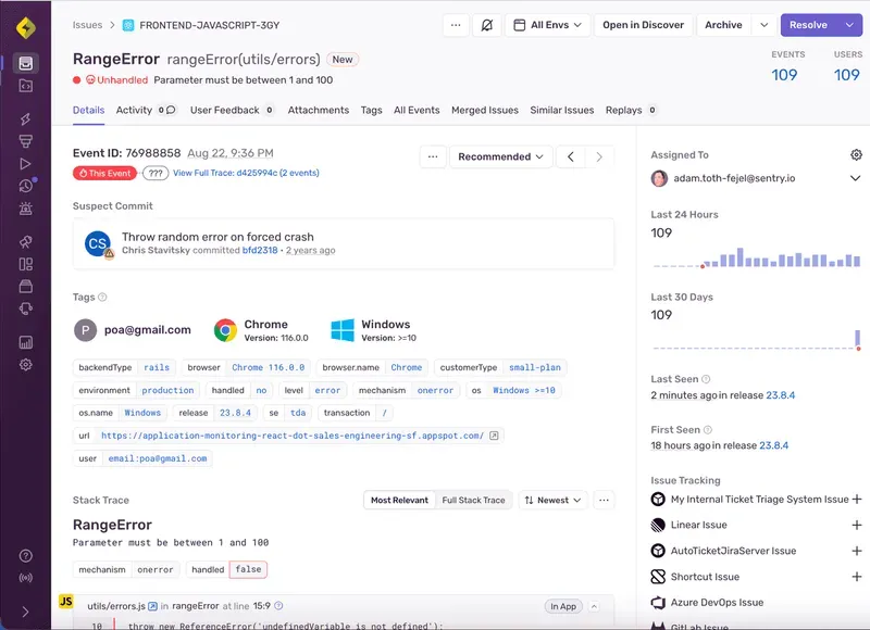 Sentry allows you to set alerts based on various conditions. For example, if a completely new error occurs, Sentry can send you an email or trigger a webhook to receive a message in platforms like Slack or Microsoft Teams, enabling a quick response to the issue.