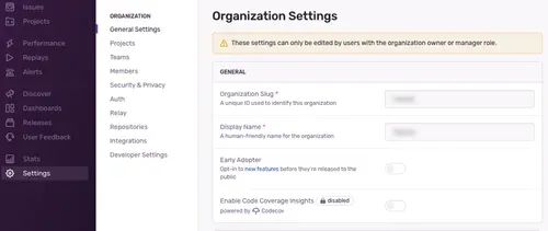 • Then go to Organization settings → General Settings, copy your organisation_slug and replace <organisation_slug> inside sentry.properties