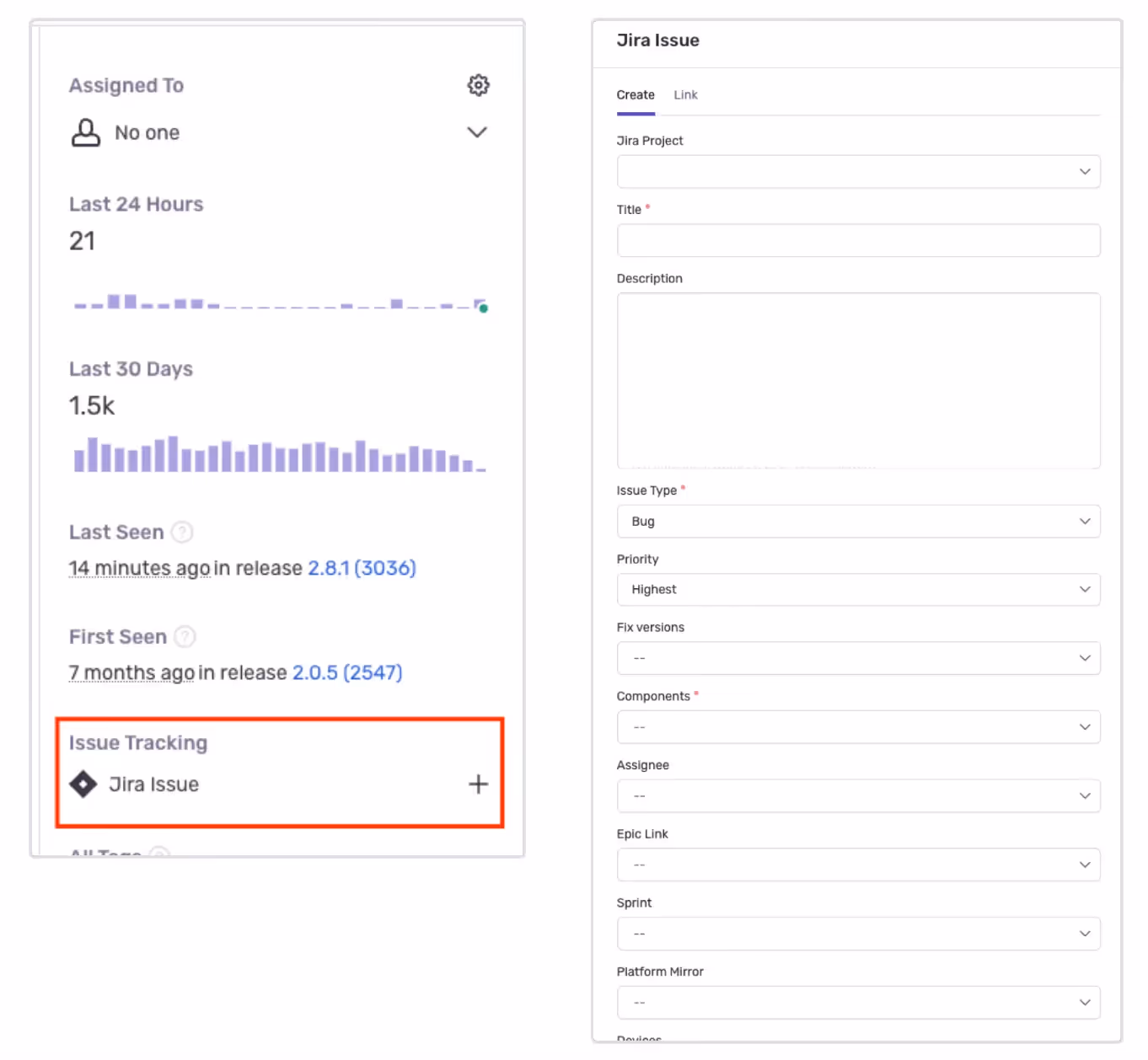 If you setup the Jira integration mentioned in the previous article, Sentry enables you to quickly and easily create Jira issues from the issue itself.