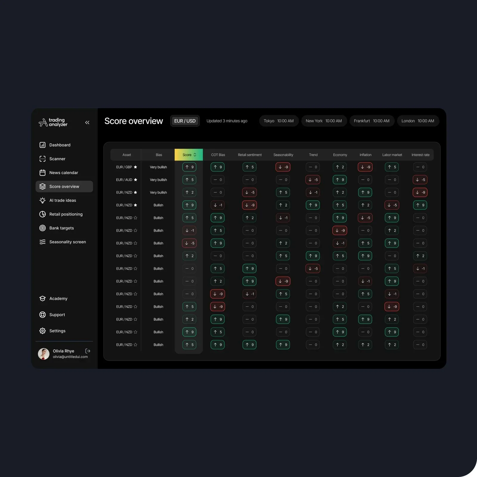 Trading Analyzer, developed in partnership with Cleevio, combines AI and fundamental analysis to accurately predict currency movements, optimizing trading strategies in the Forex markets. The platform provides a scoring system that enables traders to make informed decisions and improve their success rates.