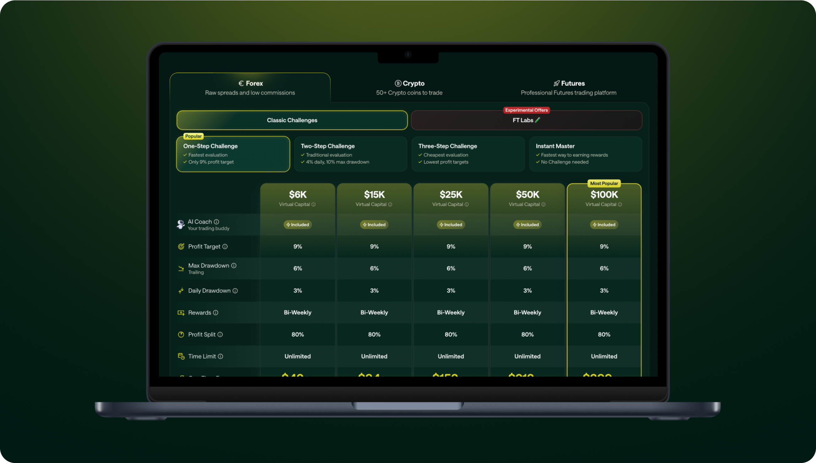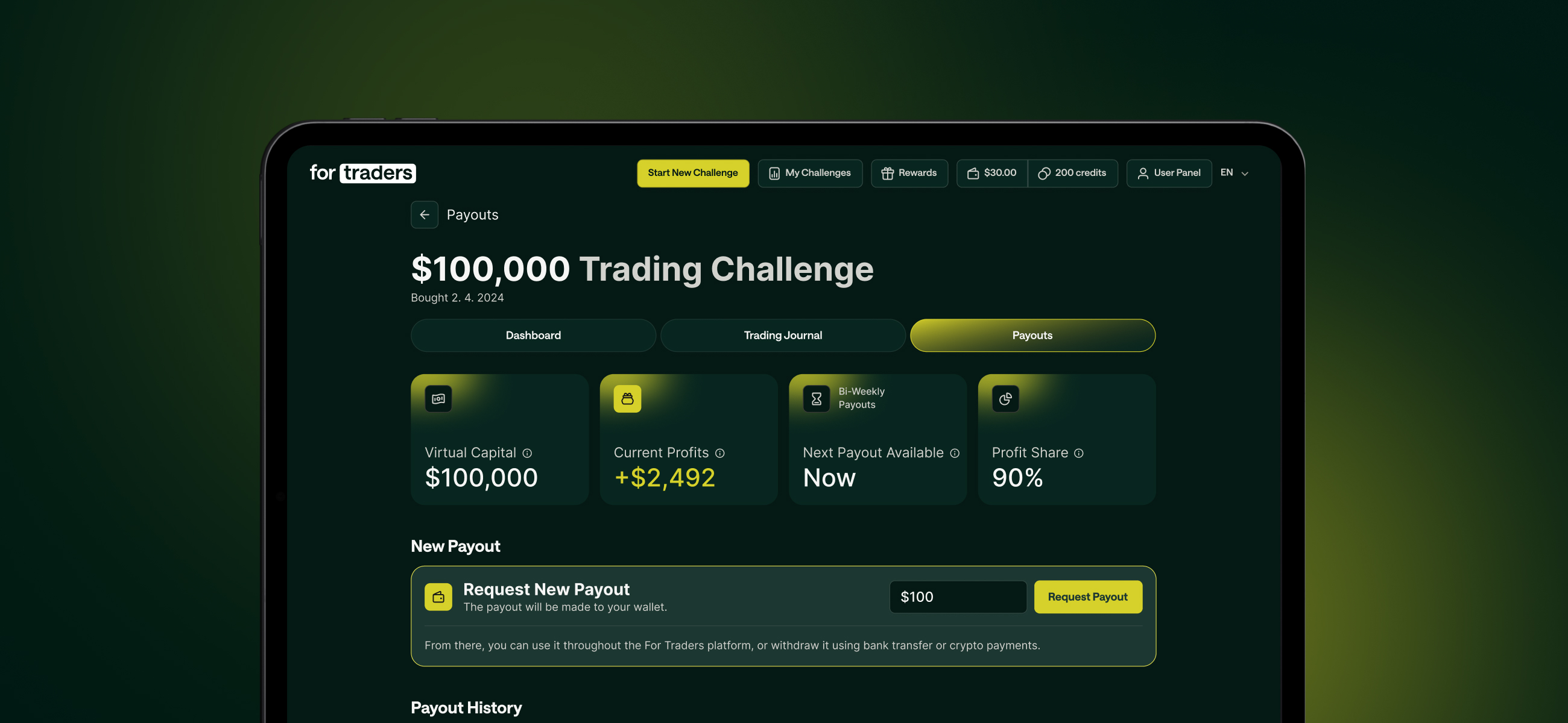 Od poloviny roku 2025 běží ForTraders plně na vlastní platformě bez závislosti na white label řešení. Vše od výzev až po výplaty funguje v jednom stabilním, rychlém a uživatelsky přívětivém systému.