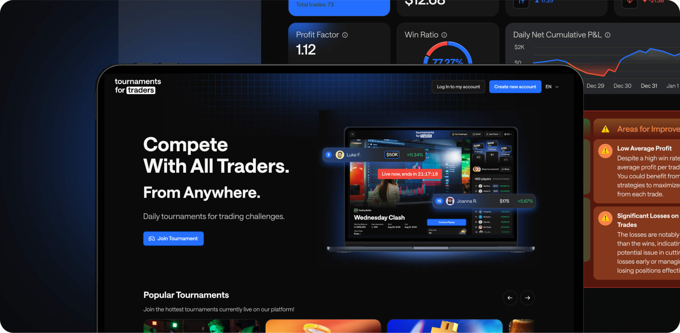 Původní aplikace ForTraders nabízela jen základní přístup k výzvám bez širšího kontextu nebo gamifikace. Nová platforma přináší celkově jiný zážitek – trader si sám nastaví výzvu, sleduje detailní statistiky svého výkonu, účastní se turnajů a komunikuje s aplikací v přehledném, moderním rozhraní.