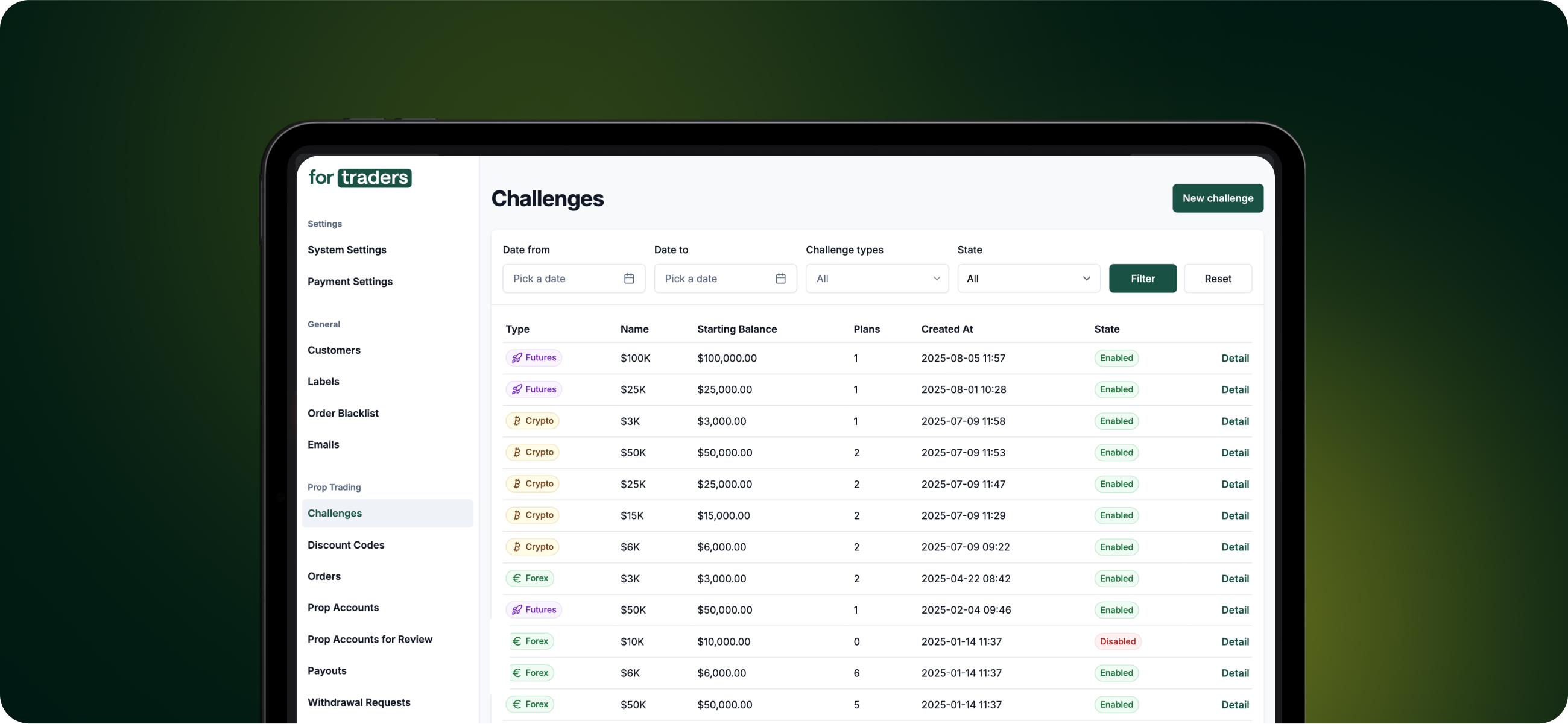 Na pozadí celé platformy stojí vlastní administrační portál, který týmu ForTraders poskytuje okamžitý přehled a kontrolu nad všemi klíčovými procesy. Administrátoři mohou během několika minut spouštět nové výzvy a turnaje, upravovat pravidla výplat, spravovat affiliate programy a dostávat automatická upozornění na důležité události.